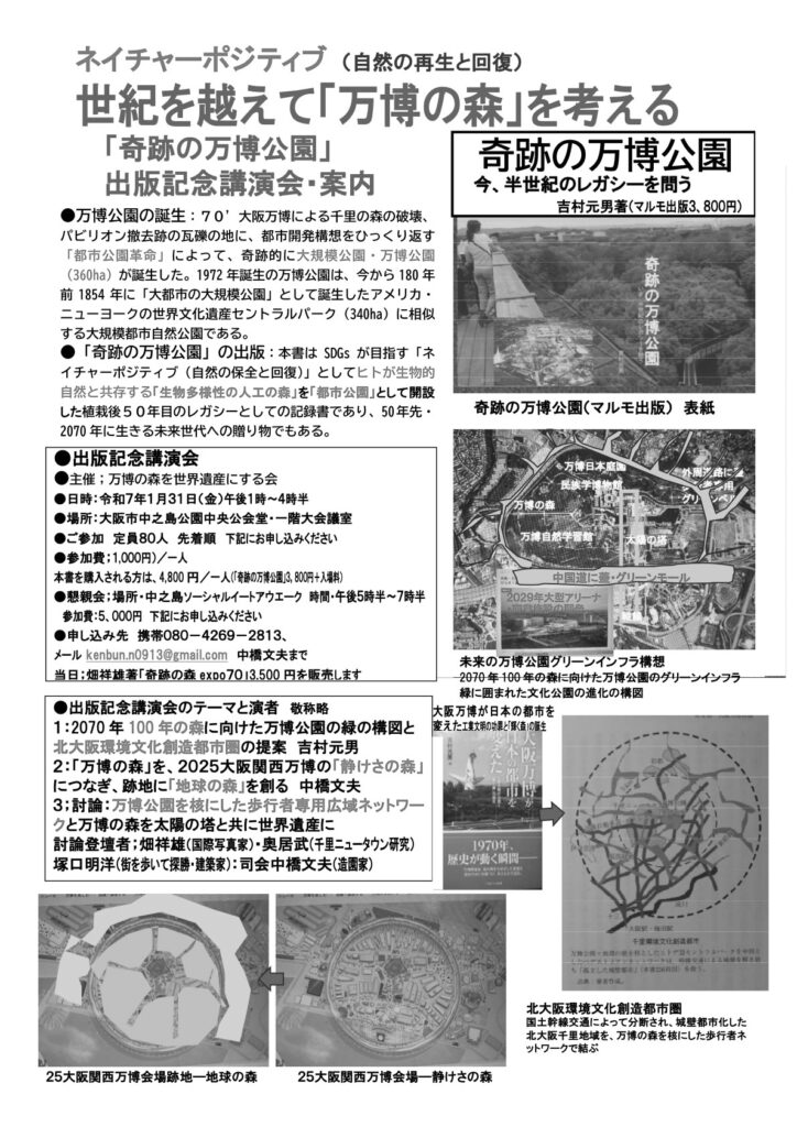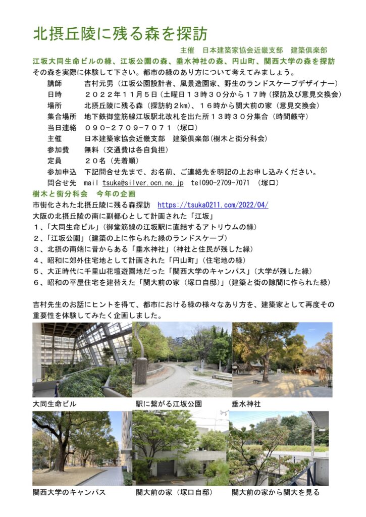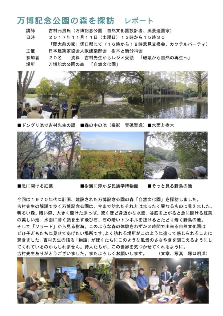 吉村先生との出会い 2011年日本建築家協会近畿支部の仲間で、4つの分科会を作り勉強会を始めました。テーマは伝統建築、近代建築、樹木と街、建築と子供たちでした。僕はこの4つのテーマは、都市の風景を守るための大きな要素だと考えていました。人々の気持ちが、今ある街の風景を作り出していると考えています。樹木と街分科会は建築家の椎原さんが始めました。専門家の人と街歩きをしました。「街(都市)の樹木の維持管理がきっちりとできていない。街の風景を壊している」と憤慨されていました。5年ほど続けましたが、専門家と話しても どうも思ったような方向性が出ませんでした。分科会のメンバーで話し合って、やはりランドスケープデザイナーの第一人者にお話を聞いた方がいいと、万博公園の設計から、新梅田シティの森の設計までされている吉村先生に話を聞くことにし森探訪のお願いしました。