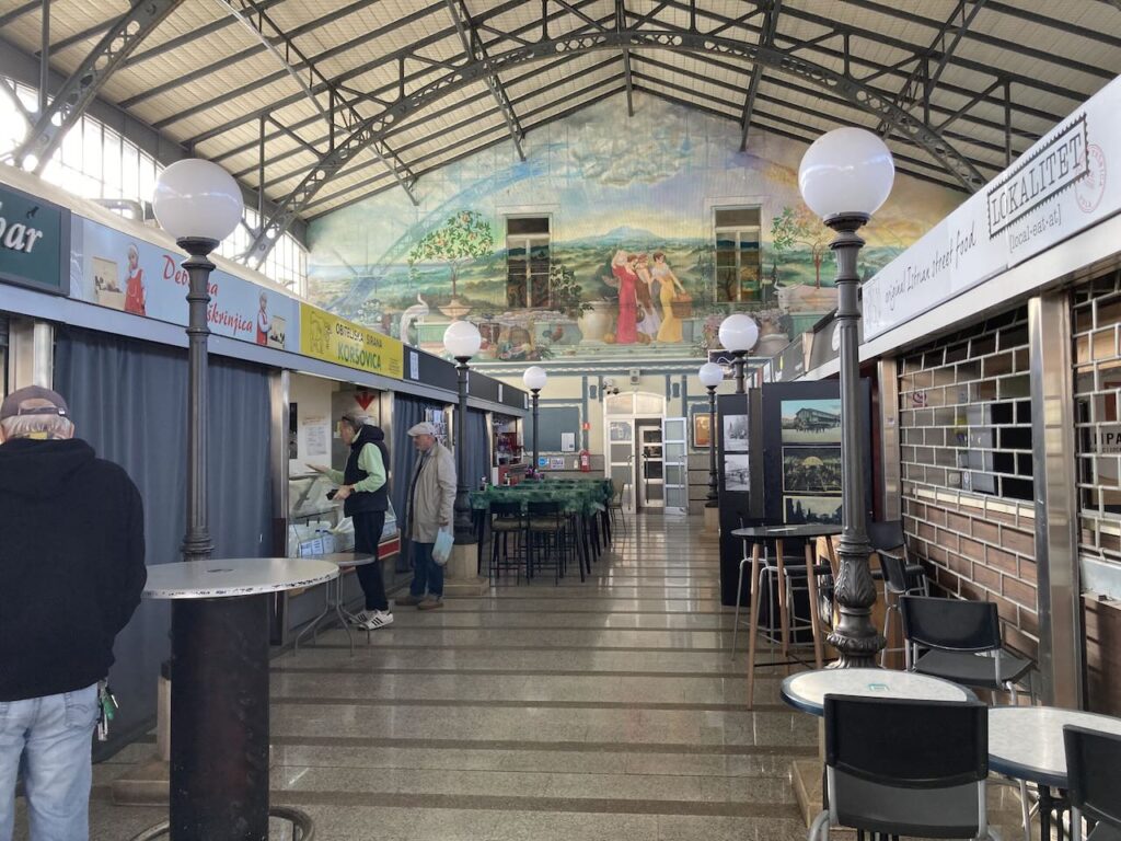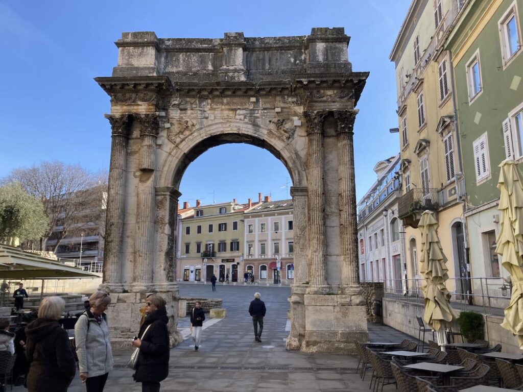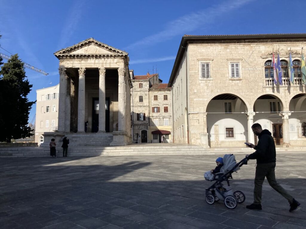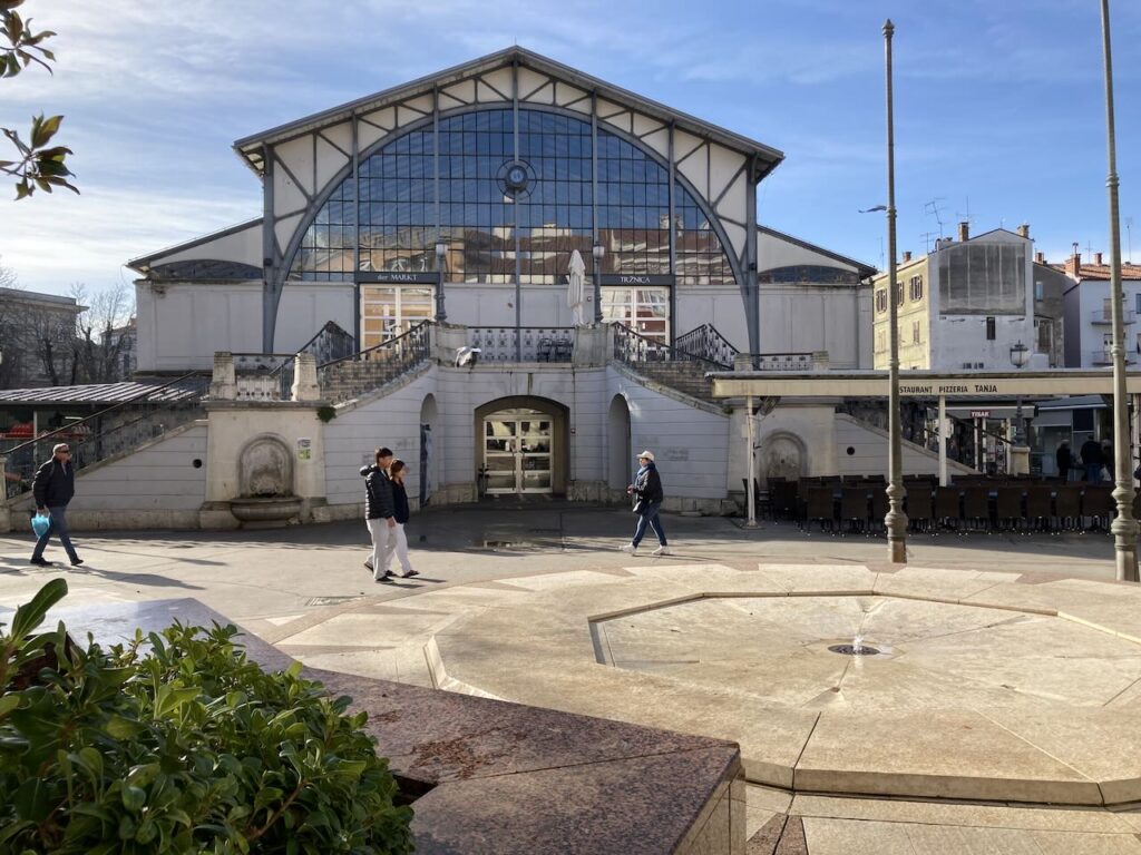 プーラ二日目、明日は日曜日で店が休みなので午前中にカーフランドで買い物をしてから街の中心地を歩くことにする。カーフランドはバスターミナルを超えた郊外にあるので途中の風景は日本の郊外住宅地と似ていた。高層住宅中心で大きな緑地を残す配置計画。買い物をアパートメントに置いて街の中心地に向かう。幹線道路から市場ゾーンに入る。少し遅い時間だったが市場はまだにぎやかだ。プーラの市場の建屋は中も外も美しい建築だ。それに場外の建物や露店が出ていていい空間を作っている。