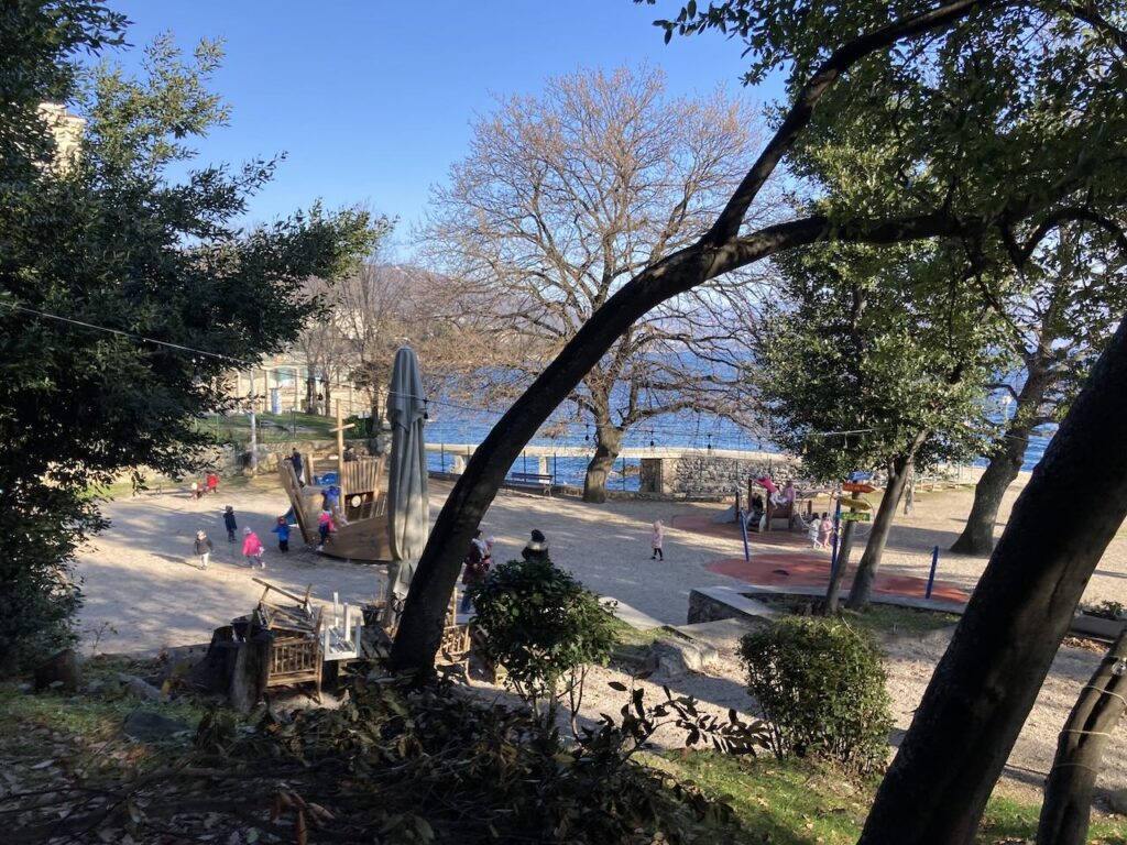 海岸沿いの公園で遊ぶ子供たち(保育所か)